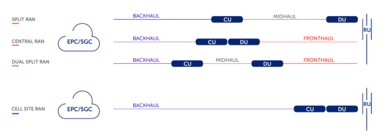 Simply put, fronthaul connectivity comes into play when the RU is located separately from the DU. Midhaul connectivity describes the communication link between physically separated DUs and CUs.